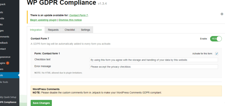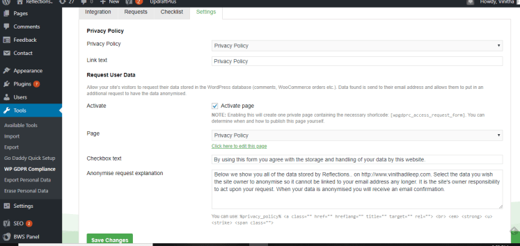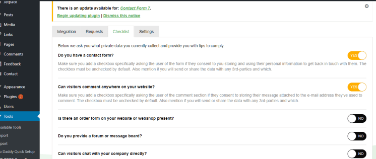 - Click on the Checklist tab on the WP GDPR compliance plugin. Below image shows my settings. Depending on the data you handle choose yes or no.
