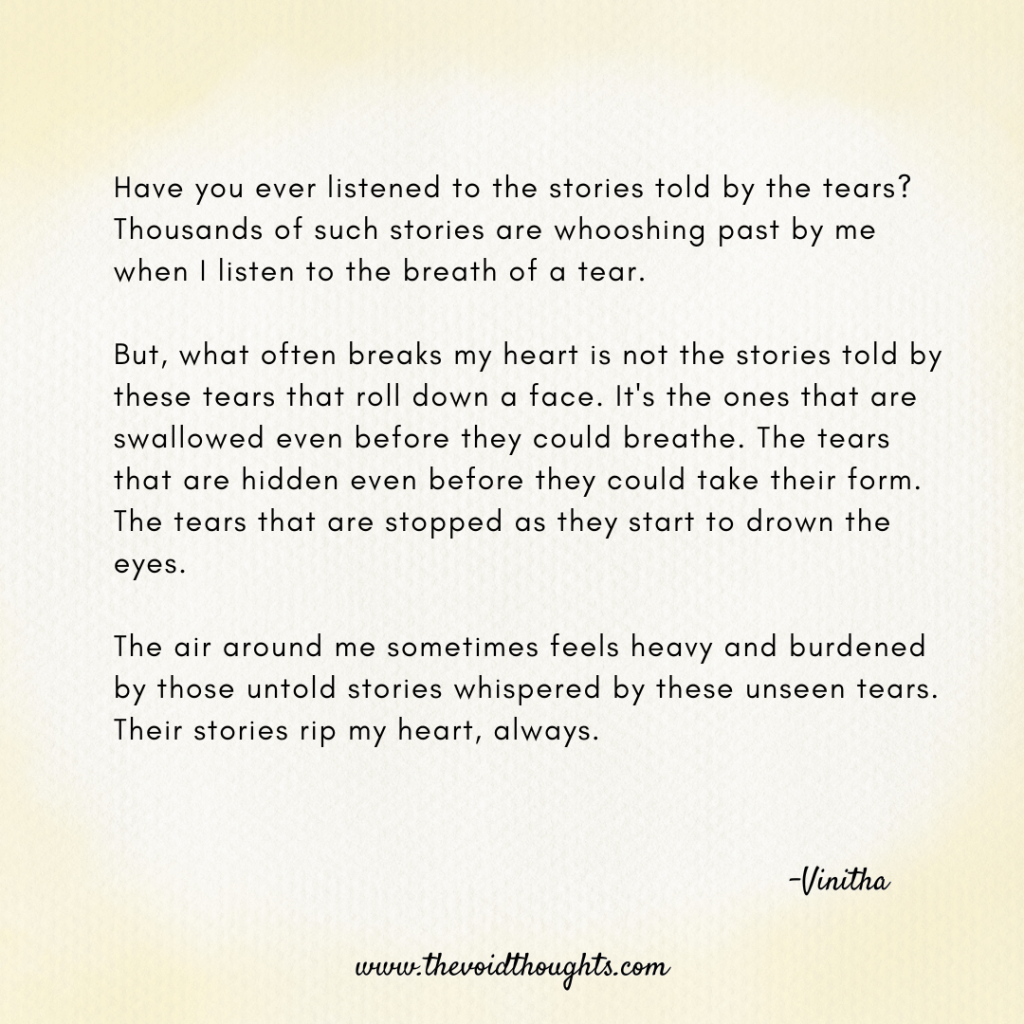 Have you ever listened to the stories told by the tears? Thousands of such stories are whooshing past by me when I listen to the breath of a tear.