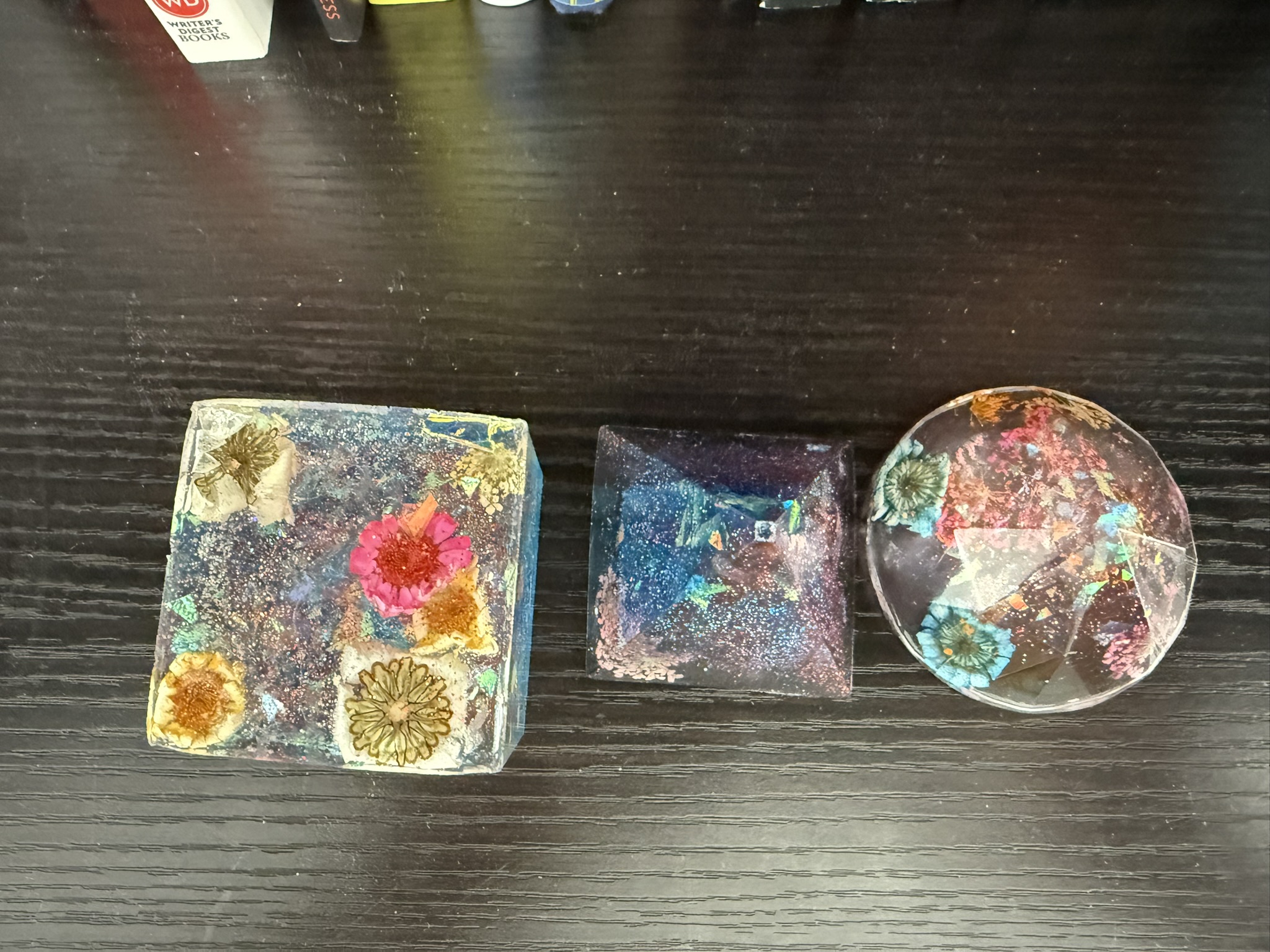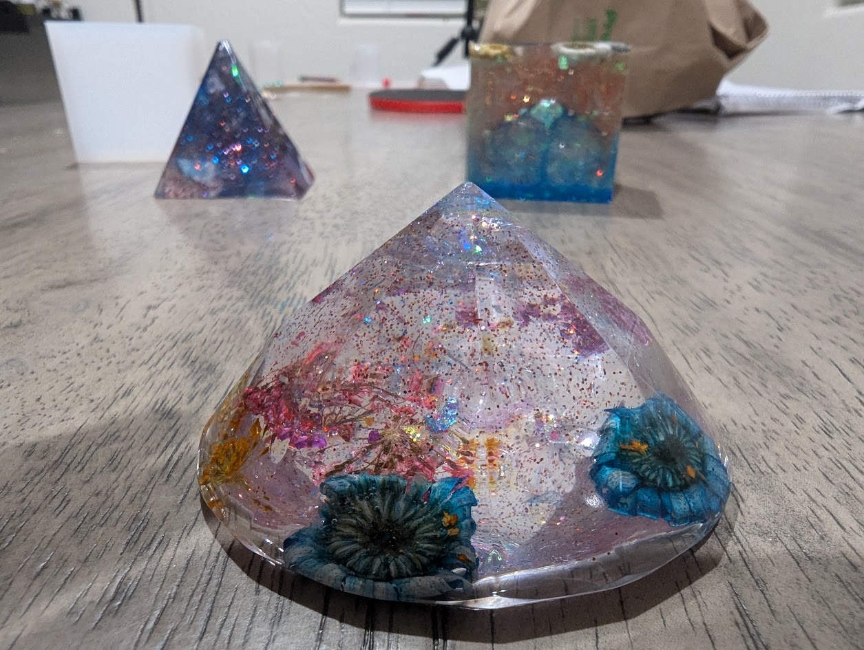 Experimenting with Resin: In October, I bought this resin kit for beginners on Amazon. Last month, I went ahead and created some shapes using resin and molds, adding glitters and dried flowers. Akku helped me figure everything out and was thrilled with the process. Together, we ended up making three shapes in one day—a cube, a diamond, and a pyramid.