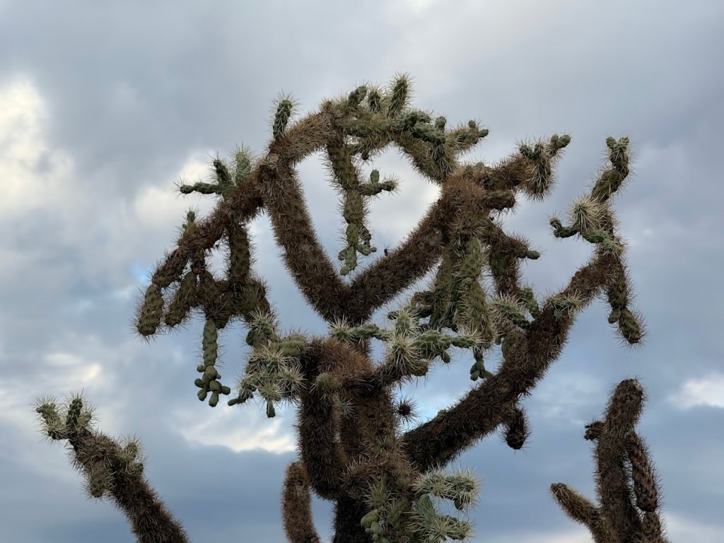 Chollas are “jointed” cacti with cylindrical, segmented stems. The segments (joints) detach easily from the main plant.